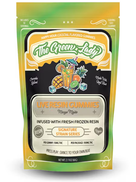 Enjoy the Green Lady Mango Mojito Live Resin Gummies (100 mg THC).